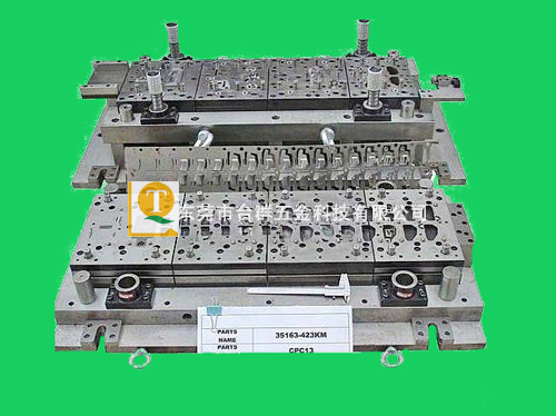 c.級(jí)進(jìn)模(也稱連續(xù)模)在毛坯的送進(jìn)方向上,具有兩個(gè)或更多的工位,在壓力機(jī)的一次行程中,在不同的工位上逐次完成兩道或兩道以上沖壓工序的模具。